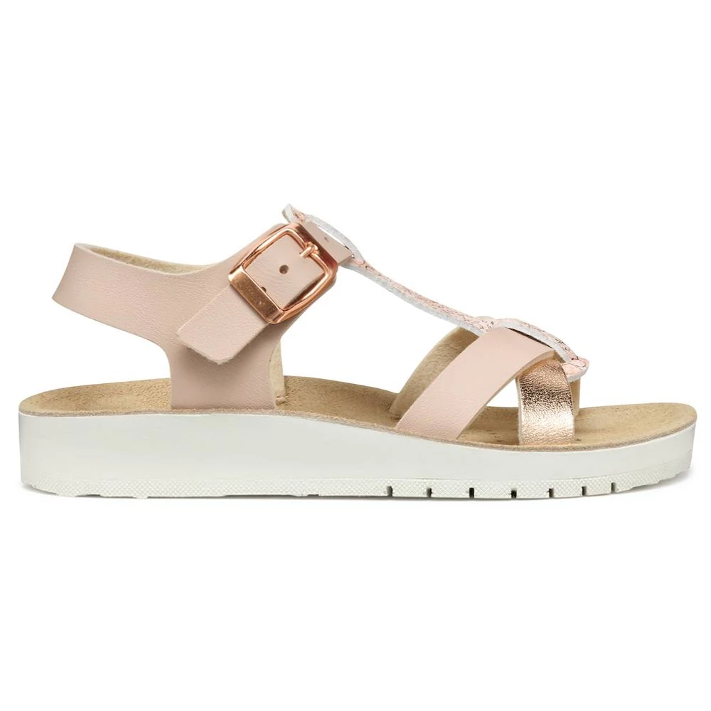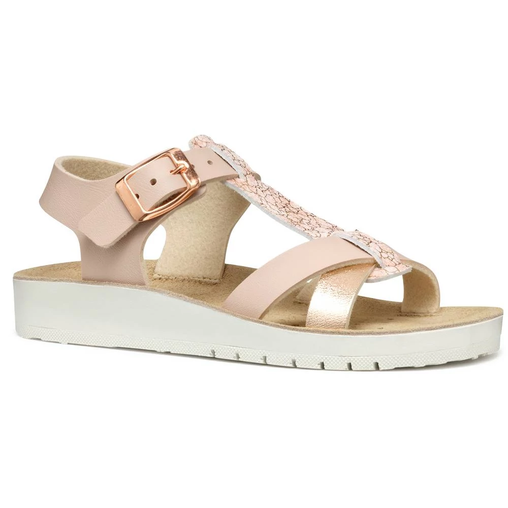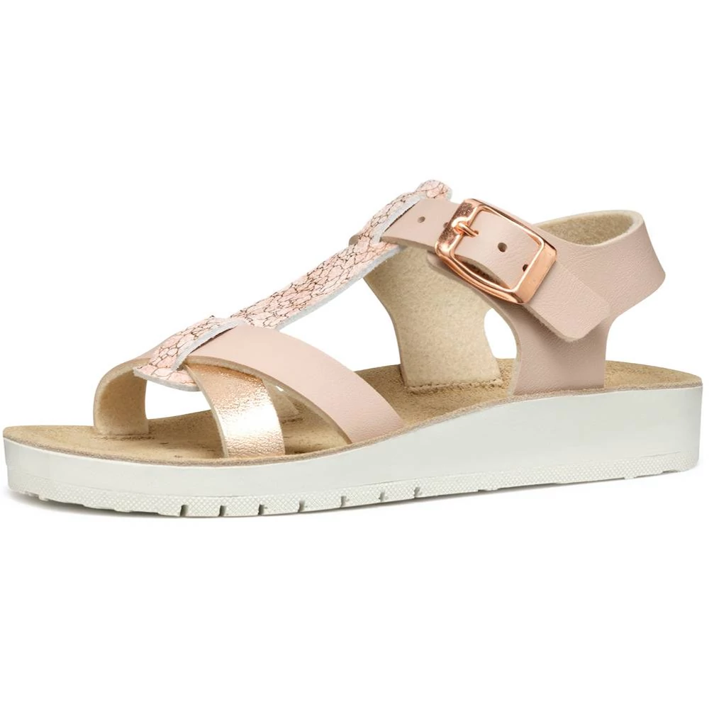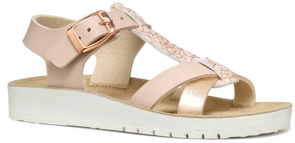 A Costarei fantázianevű Geox lány szandál egy könnyű és légáteresztő darab, amely ötvözi a kényelmet és a stílust. Az egyszerű és fényes bőrhatású anyagból készült felsőrész világos rózsaszín és rózsaarany színekben pompázik, elegáns megjelenést kölcsönözve. T-pántos kialakítása a bokánál csattal záródik, biztosítva a megfelelő illeszkedést. Ideális választás a meleg időszakokra, hogy stílusosan egészítse ki a hétköznapi öltözékeket.