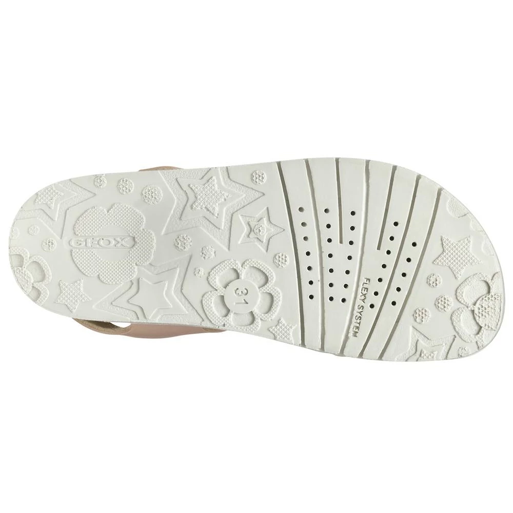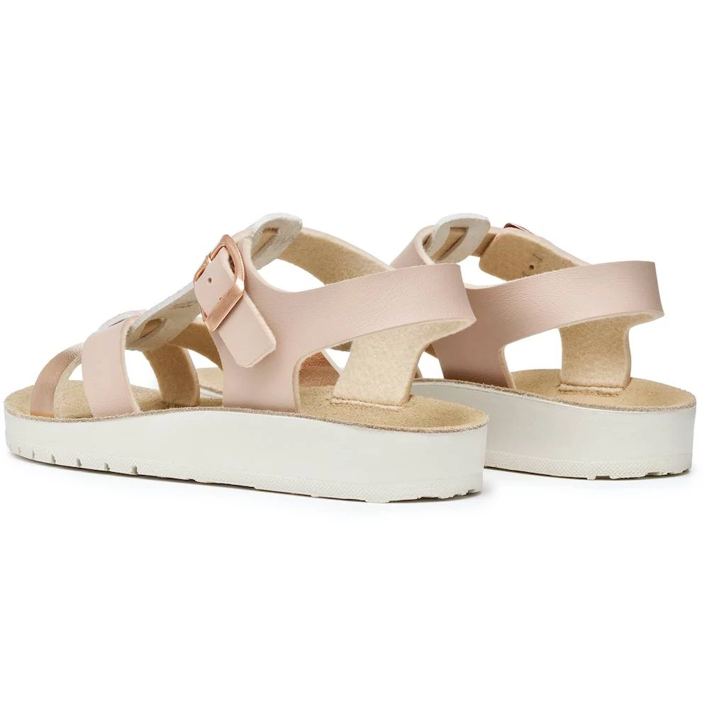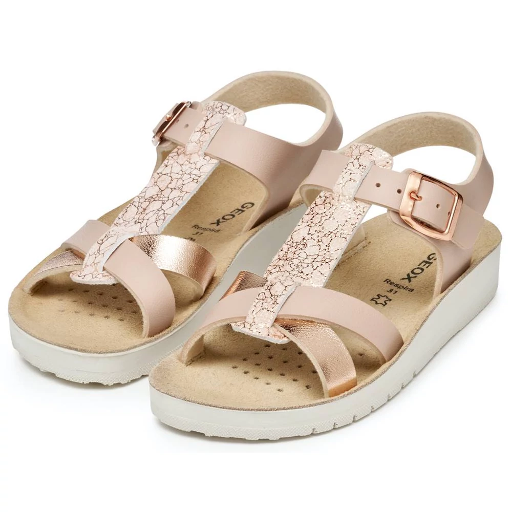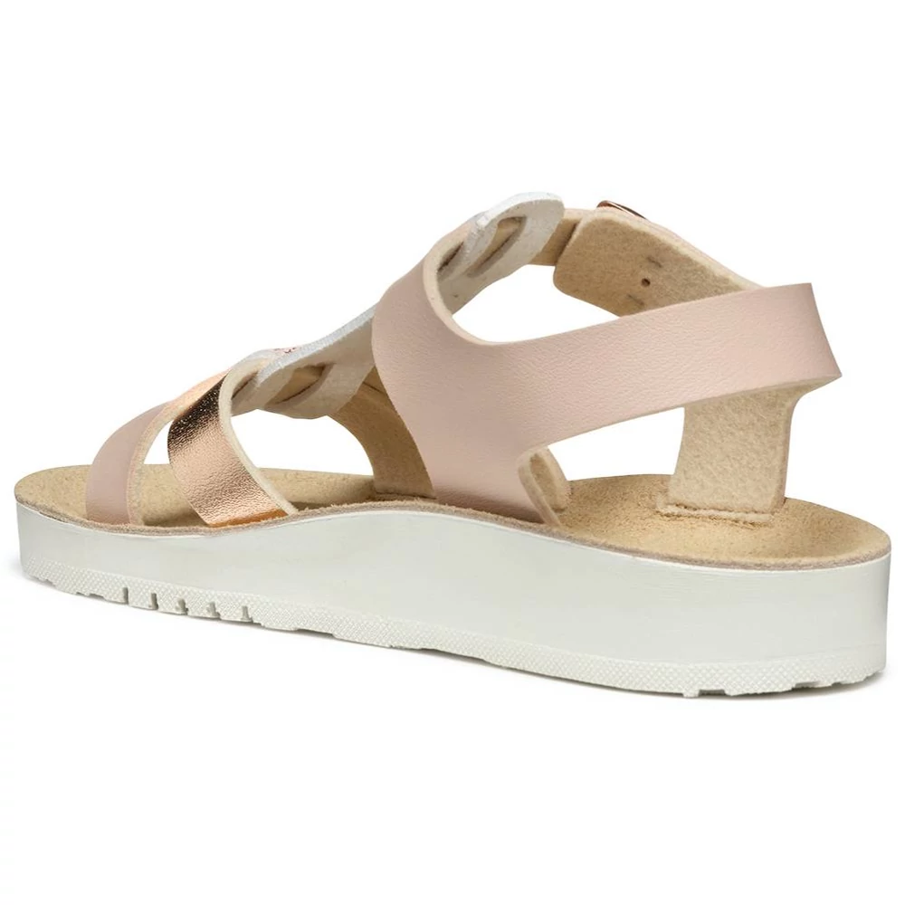 A Costarei fantázianevű Geox lány szandál egy könnyű és légáteresztő darab, amely ötvözi a kényelmet és a stílust. Az egyszerű és fényes bőrhatású anyagból készült felsőrész világos rózsaszín és rózsaarany színekben pompázik, elegáns megjelenést kölcsönözve. T-pántos kialakítása a bokánál csattal záródik, biztosítva a megfelelő illeszkedést. Ideális választás a meleg időszakokra, hogy stílusosan egészítse ki a hétköznapi öltözékeket.