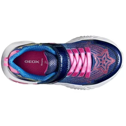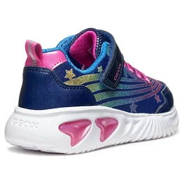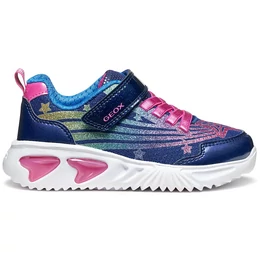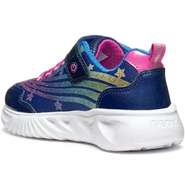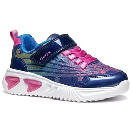 Sportos stílusú kislány Geox félcipő, modern, vagány dizájnnal, amely egyszerre biztosít kényelmet és lendületes megjelenést a mindennapokra. A Geox Assister modell sokszínű kék változata fényes textil, lakkozott hatású és gyöngyházfényű bőrhatású anyag kombinációjából készült, elegáns, csillogó hatást keltve. A talpba épített látványos világítás különleges megjelenést ad, így az Assister tökéletes választás a kis felfedezők játékos mindennapjaihoz és aktív időtöltéséhez.