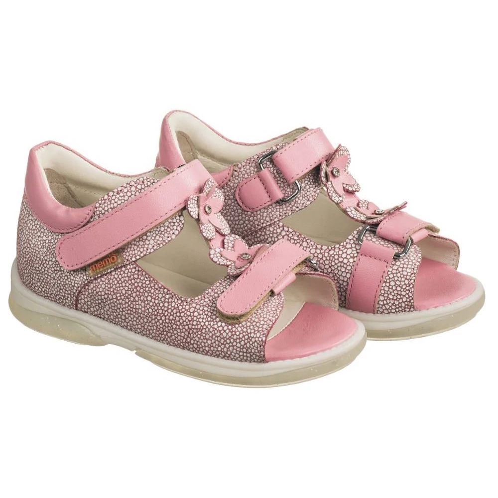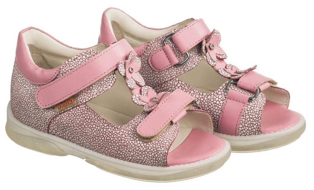 A MEMO Verona rózsaszín az alacsony/lapos lábfejtípus számára megfelelő választás. Színvilágát tekintve kifejezetten lányok részére terveztük. A két tépőzáras, szupinált, alacsony szárú szandál kül- és beltéri használatra egyaránt alkalmas. A Verona szandál rózsaszín alapszínű anyagában elszórtan, sűrű fehér pettyes nubuk bőr részekből áll. A két tépőzár és a sarokgallér világos rózsaszín színbőrből készül. A tépőzárak közötti dupla sziromstruktúrájú, középen csilámkővel ékesített virágokból álló rüszt díszítés igény esetén levehető a szandálról. A diagnosztikai talp átlátszó, csillámos arany porral hintett gumiból készült a lábbelihez. Részletes tájékoztatóért klikk ide!