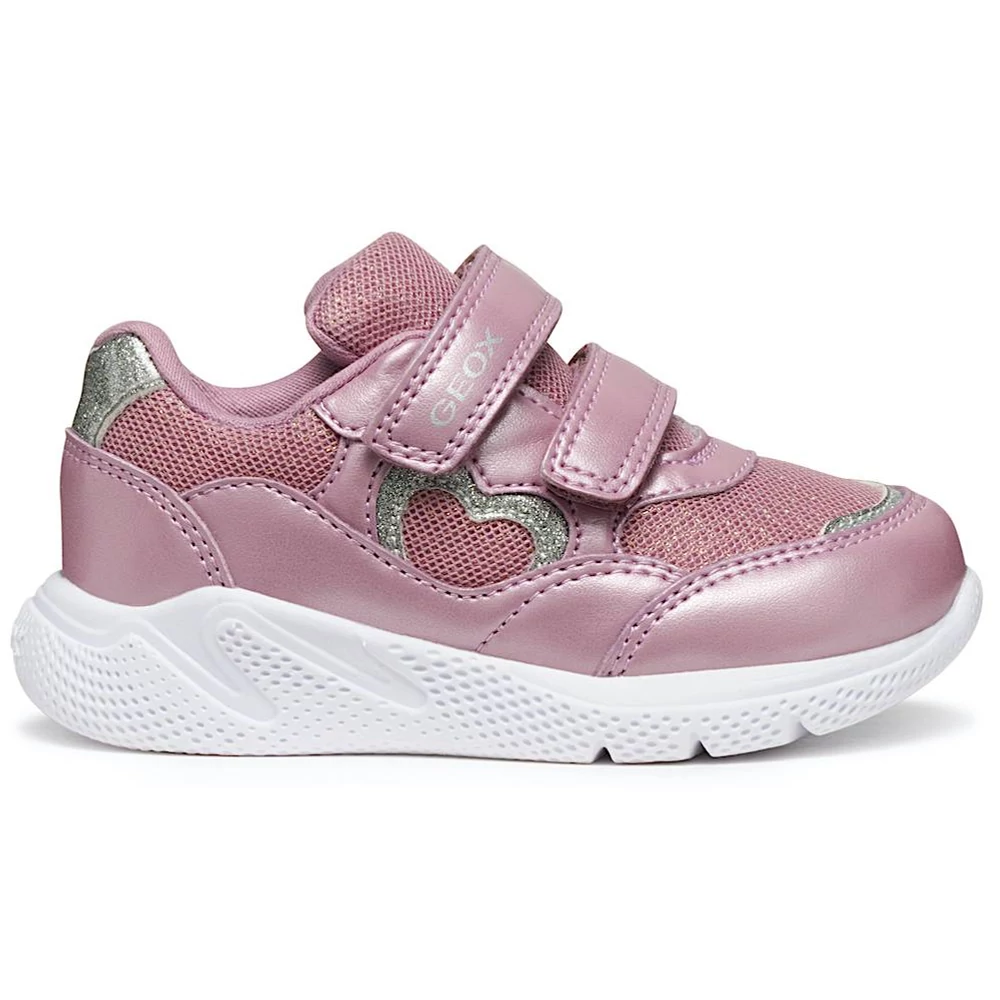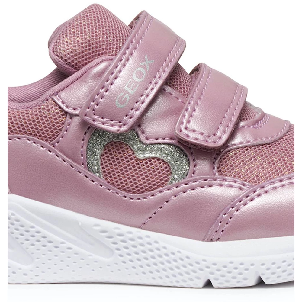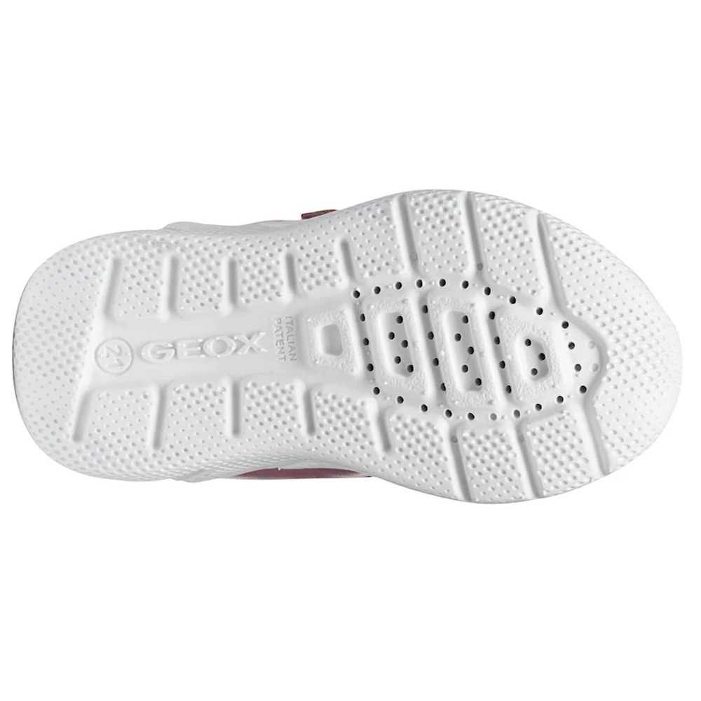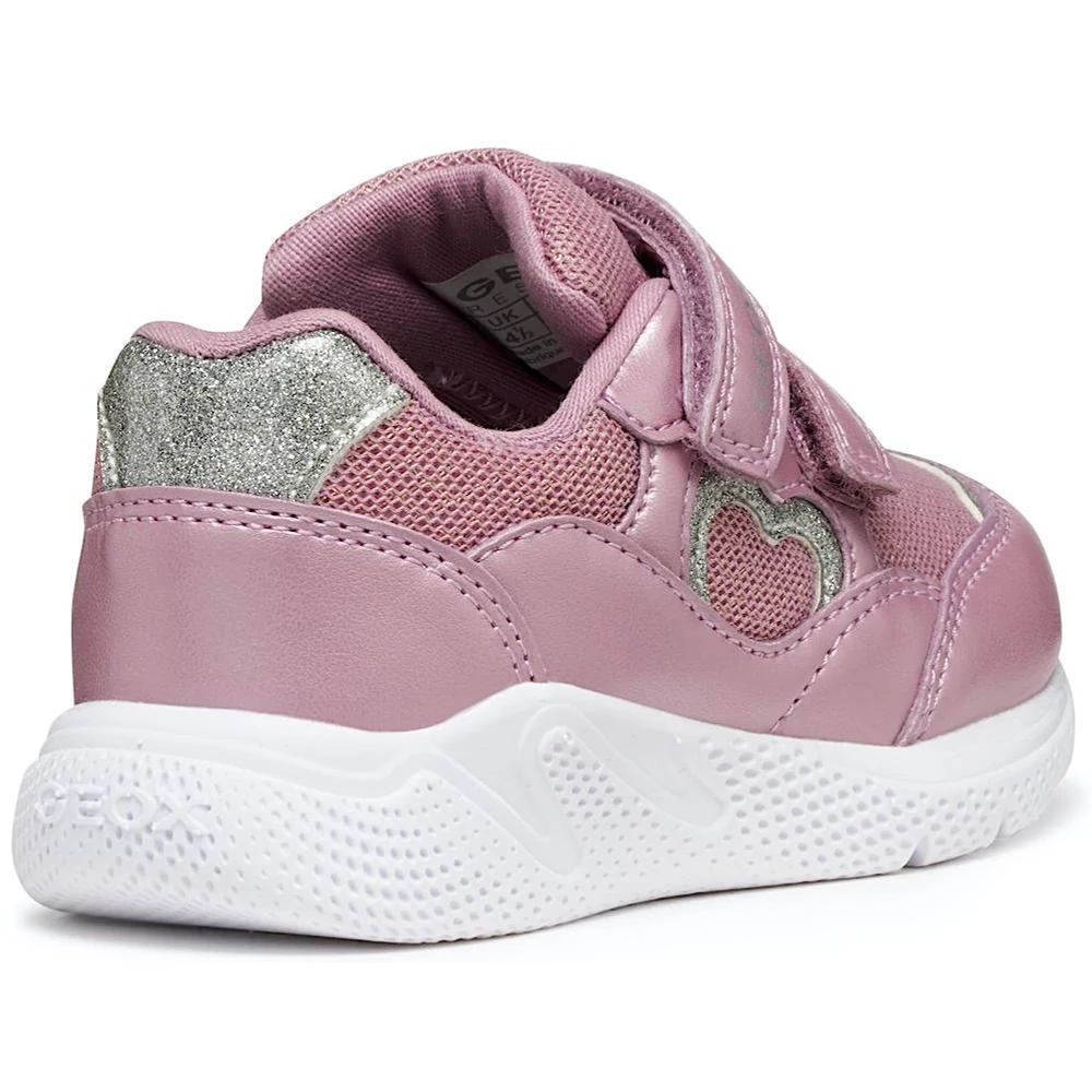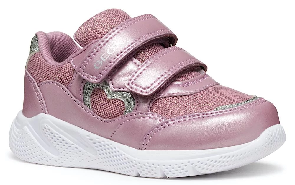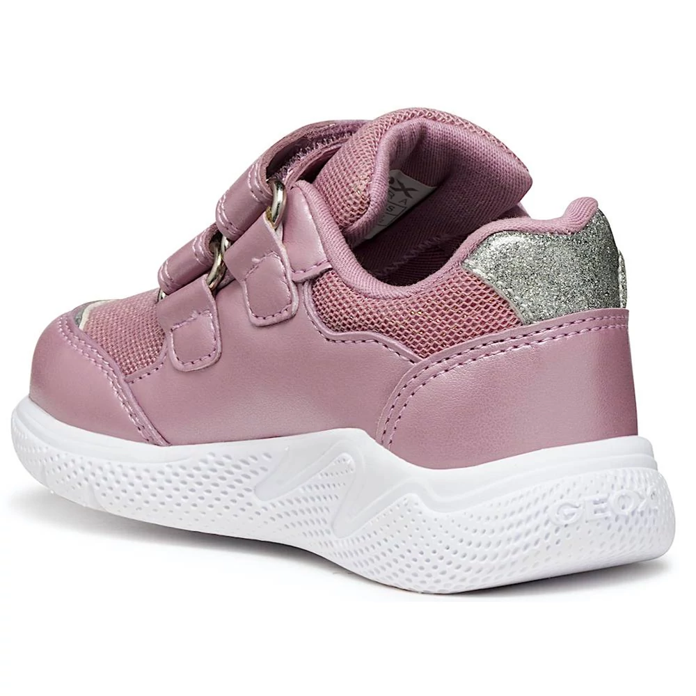 Modern, sportos megjelenésű Geox kislány félcipő, dinamikus, modern dizájnnal, amely a futócipők stílusában készült. A cipő rózsaszín felsőrésze fényes légáteresztő hálós anyagból és gyöngyházfényű bőrhatású anyagból készült, elegáns részletekkel kiegészítve a nőies megjelenés érdekében. A Geox Sprintye model merész, vagány dizájnjával garantáltan elnyeri a kis felfedezők tetszését, és tökéletes választás a mindennapi viselethez.