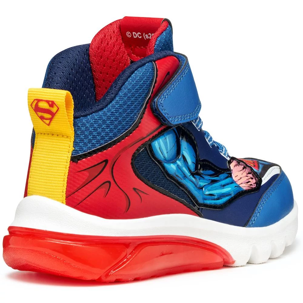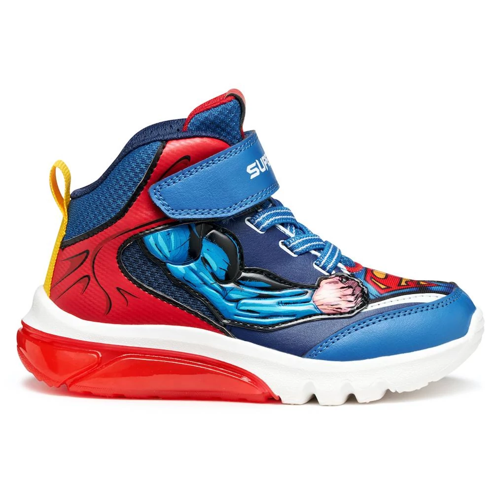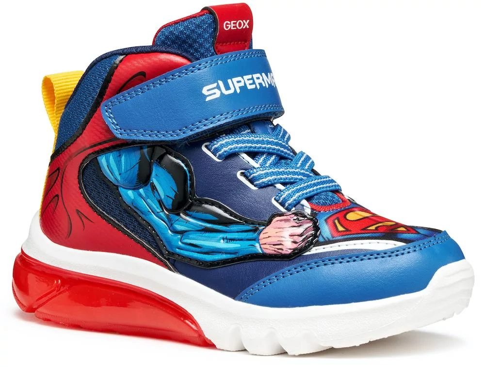 Fiú Geox sportcipő lendületes, dinamikus dizájnnal, amely Superman ihletésére született a Geox és a Warner Bros együttműködésében. A kék és piros színváltozat bőrhöz hasonló hatású anyagból és hálós betétekkel készült, így játék közben is kényelmes viseletet nyújt. A Geox Ciberdron modell különlegessége a talpba épített vidám fényjáték, amely minden lépésnél felvillan, stílust és izgalmat csempészve a mindennapi kalandokba.