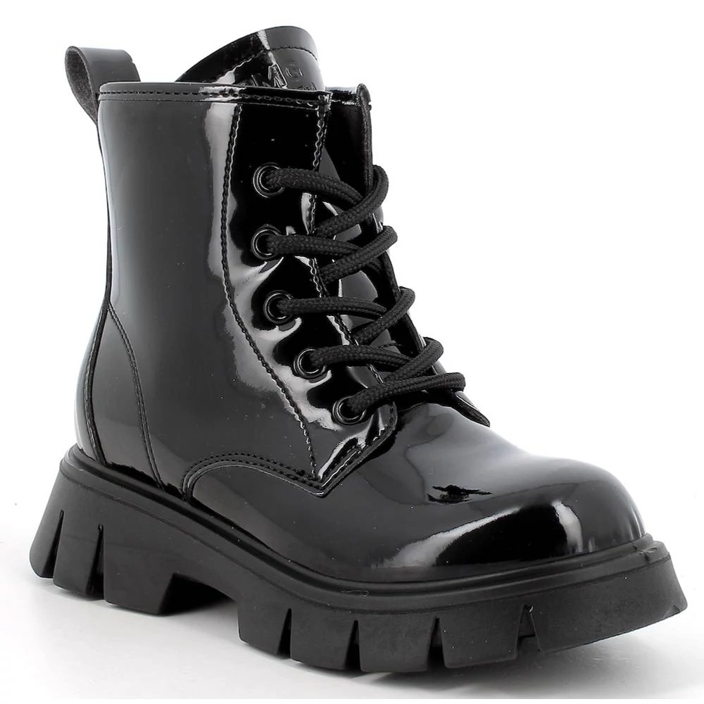 Trendi, lakkbőr Primigi lányka bakancs. A klasszikus bakancs stílushoz illő fűző és belső oldali cipzár könnyebb kezelhetőséget biztosít.