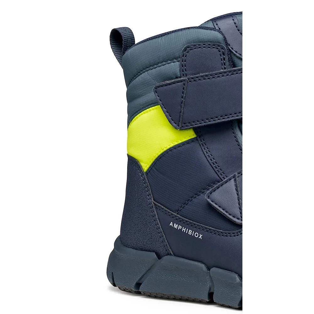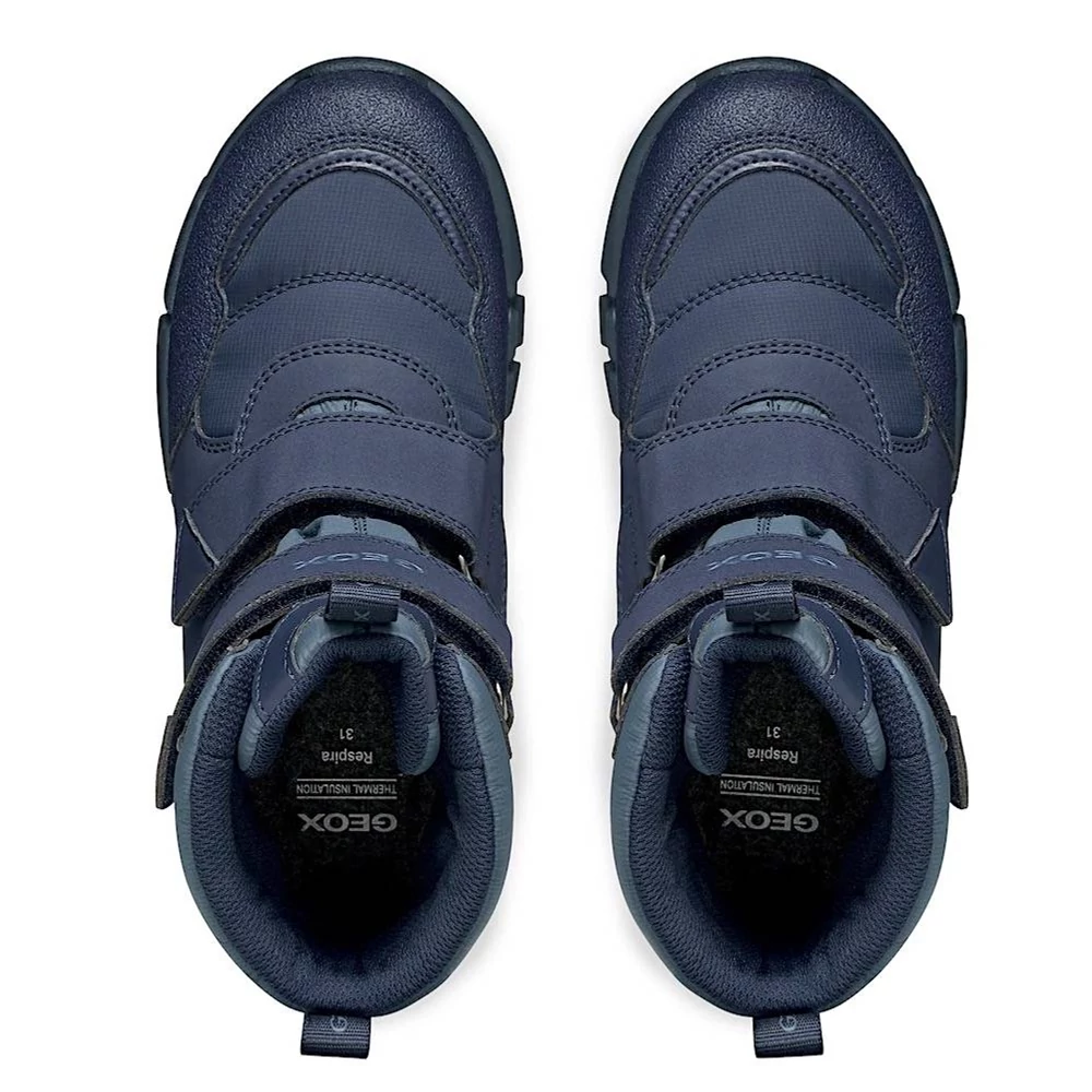 Kényelmes, vízálló, hibrid kialakítású, hőtaposő stílusú bokacsizma junior méretben. A Geox Flexyper ABX modell sötétkék változata ideális választás a hideg időben történő szabadtéri kalandokhoz, gondtalan viseletet biztosítva. Ez a strapabíró, jól párnázott cipő bőrhatású anyag és ECONYL®, újrahasznosított nejlonszál kombinációjából készült.